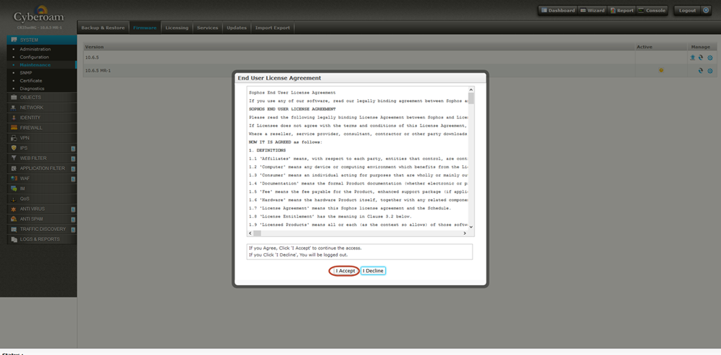 Mevcut çalışan CyberoamOS versiyonu seçilir.