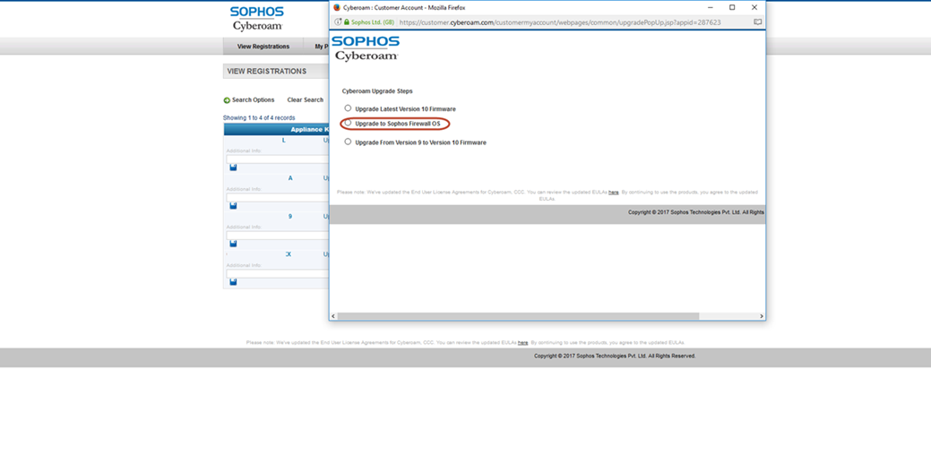 Yedek alma işlemi tamamlandıktan sonra Customer.cyberoam.com adresinden Upgrade işlemi için kayıt yapılır.